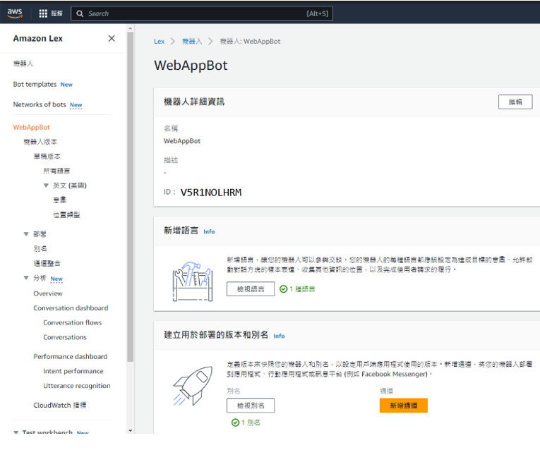 Step 6. 搞定後台之後, 接著要搞定前台. 首先在 Amazon 的 Lex, 做一些規定好 (=死) 的設定. 建立出一個名叫 WebAppBot 的機器人. 為了讓 Amazon 前台後台能夠相認, 不意外前台也有一個 ID, 例如: V5R1NOLHRM.