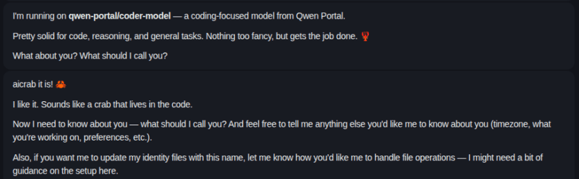 - 賜名 – 我把它取名為螃蟹, 不管是 AICrab、MyCrab,它都會把圖示改成螃蟹。也就是說它在乎自己的名字,而且理解其意義。