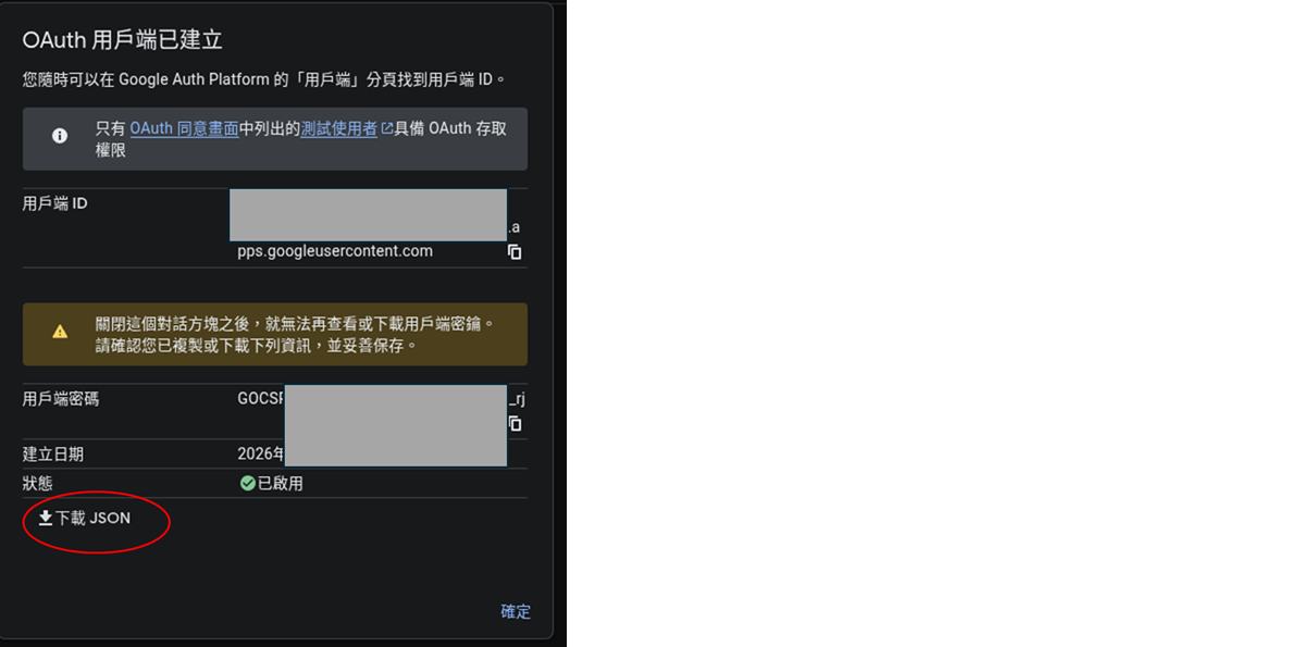 • 點擊建立後,從下方的紅色圈起來的地方下載 JSON 檔案