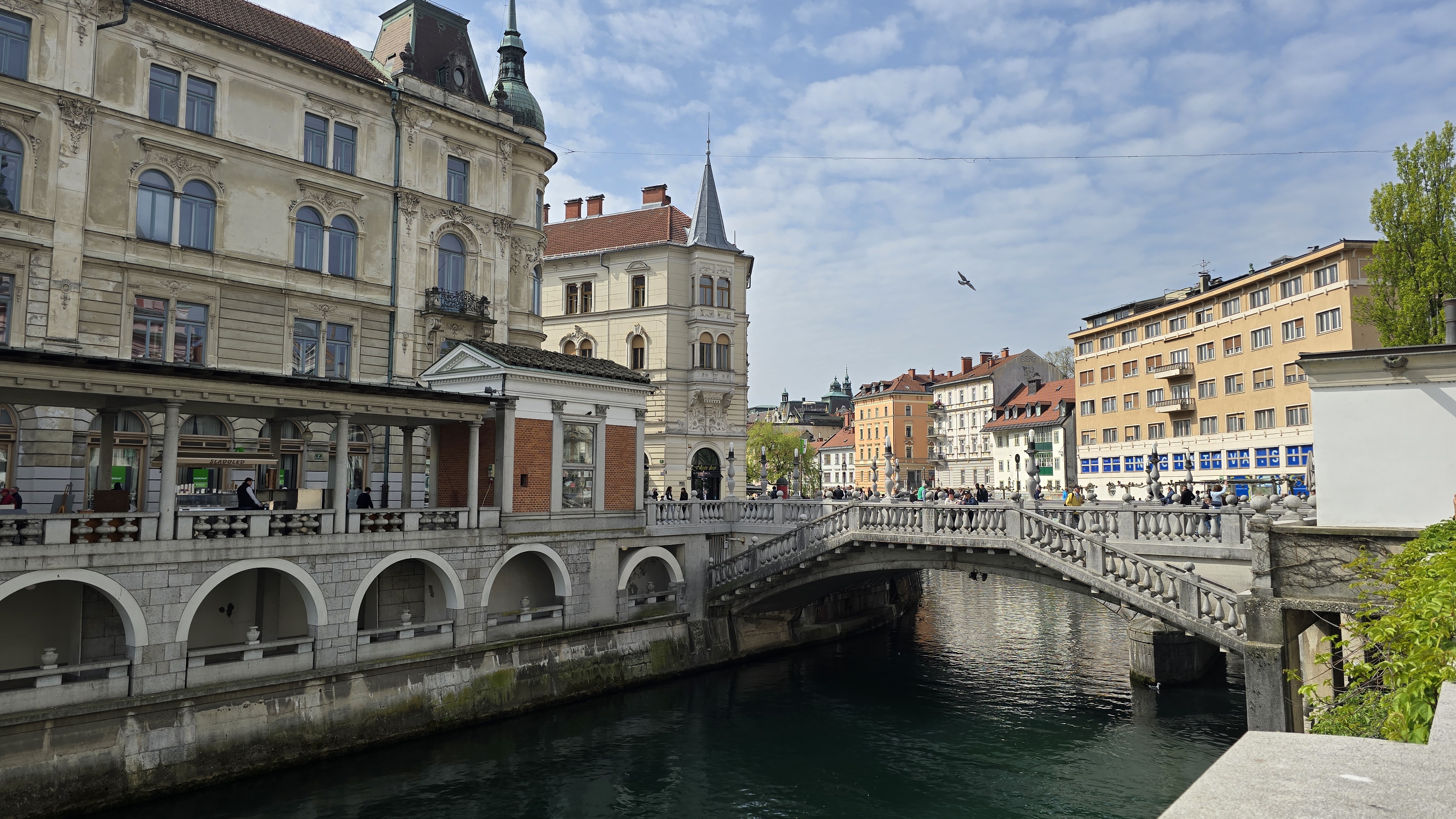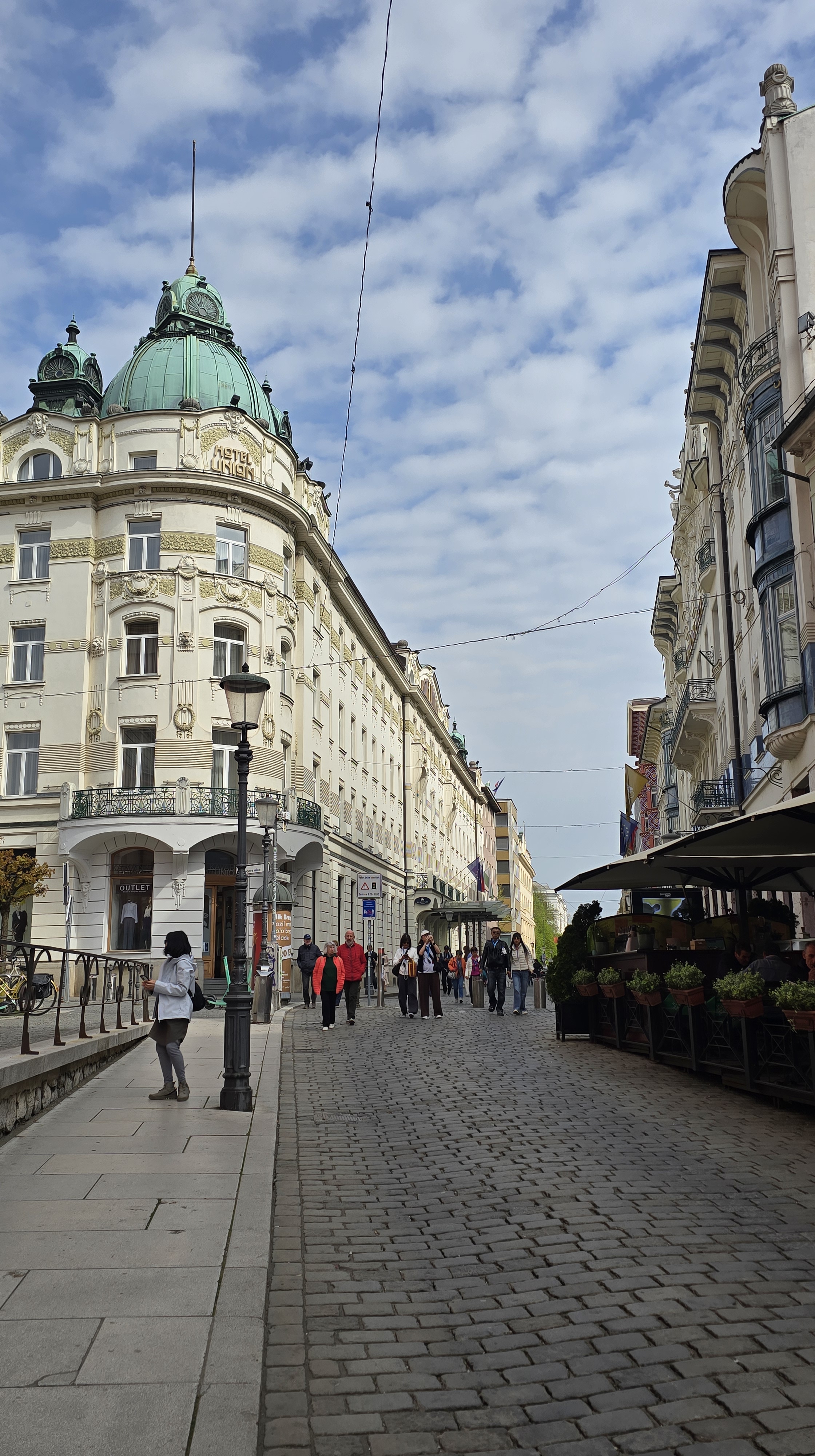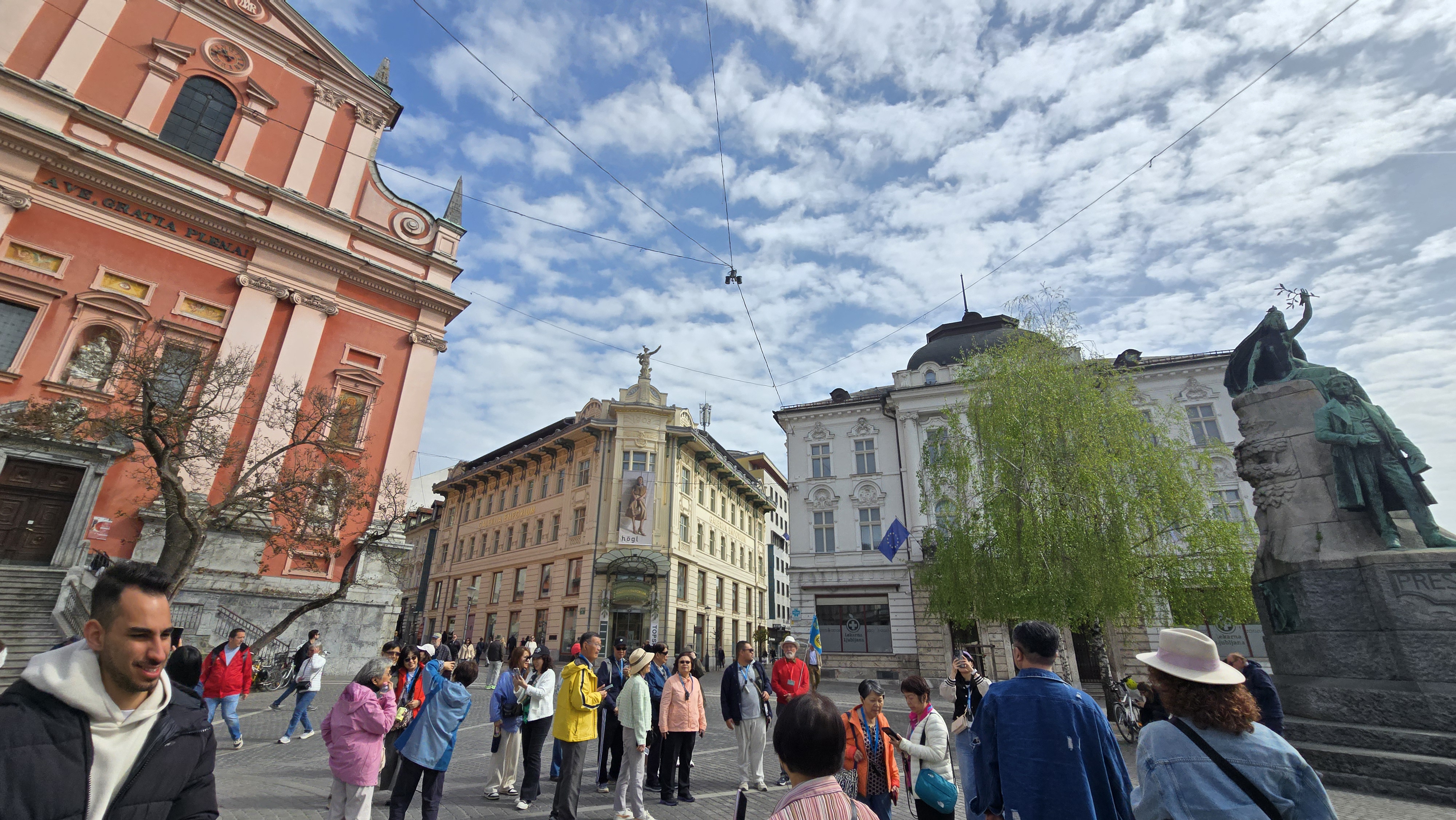 經過伊斯坦堡的轉機,我們在早上十點鐘左右,開始盧比安納市區觀光。據說這裡是歐洲最大的行人徒步區。由於 4/12 是週日,幾乎所有的店家都沒開門營業,能逛的都是專做觀光客生意的攤商或是餐廳。好在,建築物都堅持上班,留在原地給我們拍照。