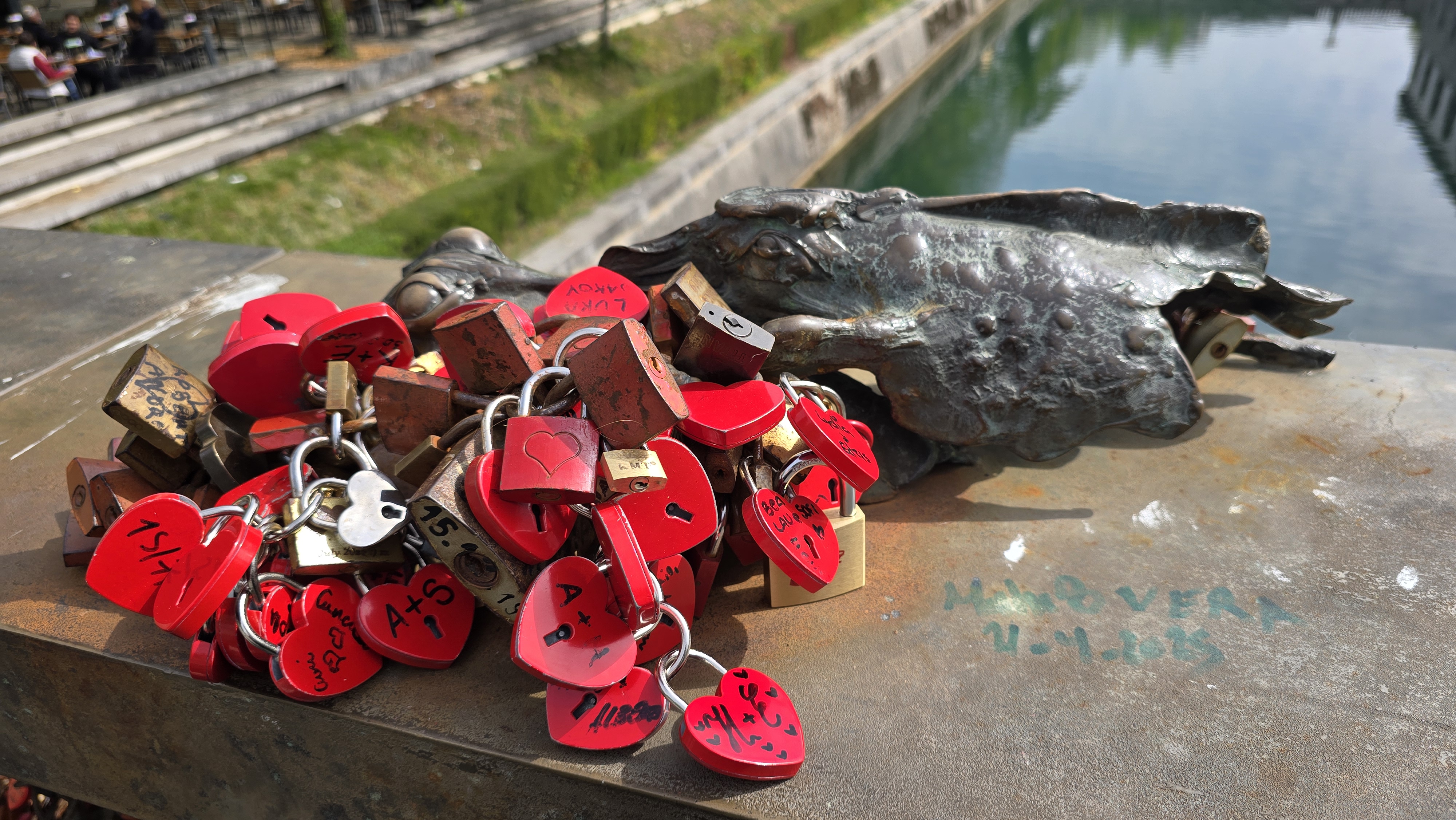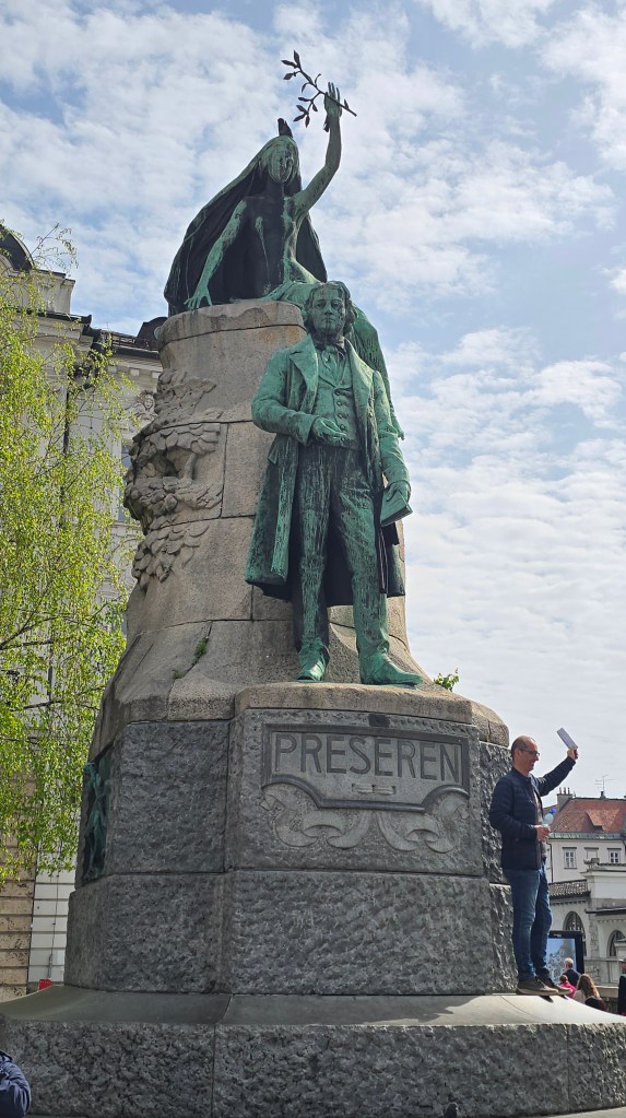 市中心有一座詩人 Preseren 的青銅像 (下圖左),他以藏頭詩聞名於世。能搞個銅像放在首都的市中心,這已經是 “蔣公" 級別了。整座銅像除了 Preseren 本人,還加上了他的夢中情人茱麗葉陪伴。茱麗葉披著披風坐在他的身後,為他遞上月桂樹枝。Preseren 本人則是望著兩百公尺遠的茱麗葉家二樓窗戶的方向。據說這個披風是為了旁邊教堂而加上去的,免得太過裸露而對教堂不敬。以上都是導遊說的八卦。