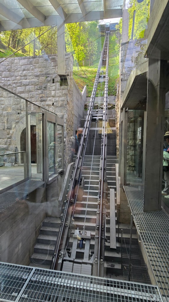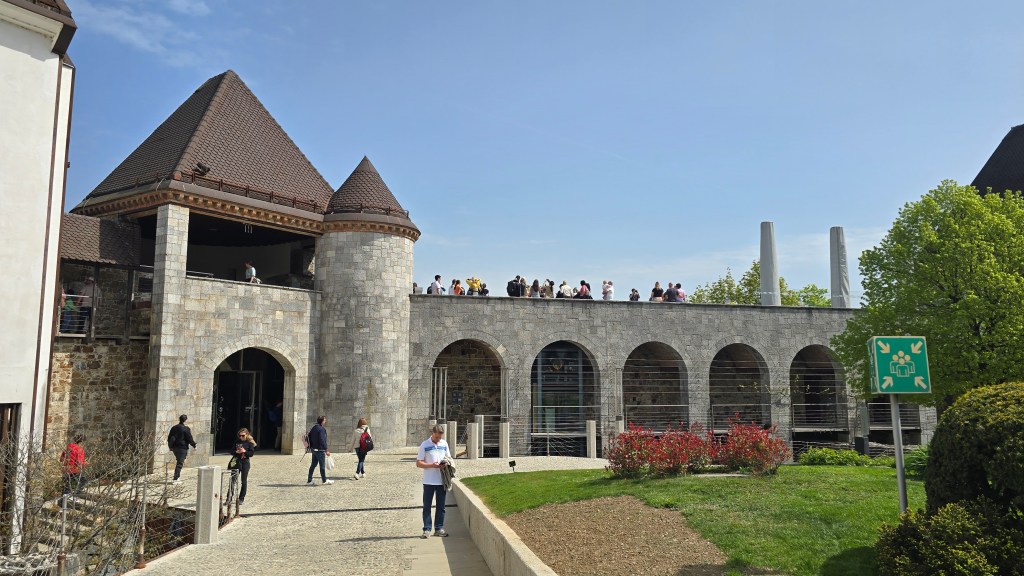 原本盧比安納城有城堡和城牆,都市改造後他們把城牆拆了,而且把教堂旁邊的墳墓都移到郊外,至於山頂上的城堡還保持完整。觀光客可以搭纜車上去。從城堡裡的高塔又可以眺望整個城市,遠眺周遭的大國。右下圖是一家特產店,它的廣告牌把所有的國家都畫成愛心的形狀,其中左上角箭頭指的就代表台灣的黑熊愛心。