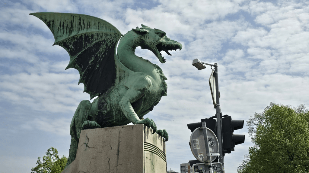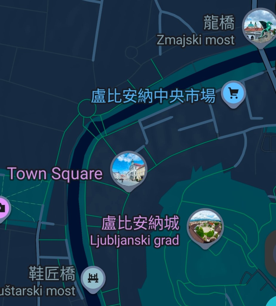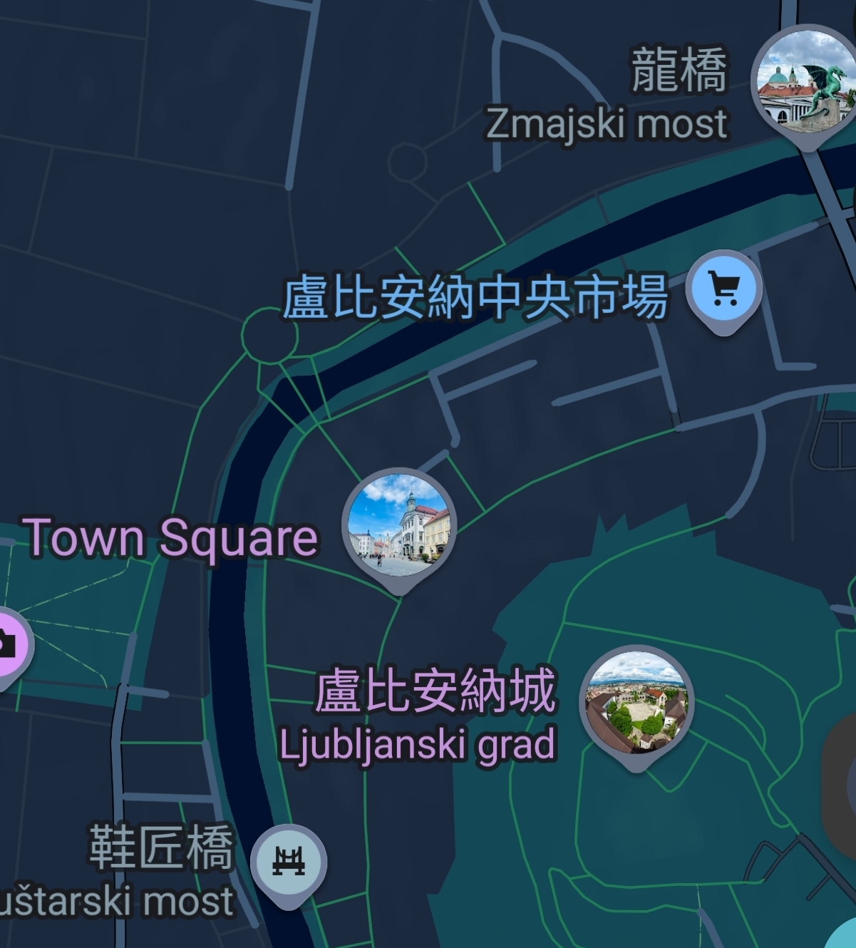 銅像位於 Town square 之處,旁邊有座三重橋,三橋緊臨著跨越盧比安納河,顯示出過往的人流之大。往東是盧比安納中央市場,原本市場內的傳統店家現在幾乎都被餐廳、咖啡廳取代了。龍橋 (上圖中) 是裝飾四隻大飛龍和許多小飛龍,過了橋就是城外。飛龍這個 “怪獸" 在別的城市都是王子要斬殺的反派,但是在盧比安納卻是吉祥物的代表,到處都在賣飛龍娃娃 (上圖右)。據說飛龍曾經拯救過這座城市,所以居民特別愛龍。