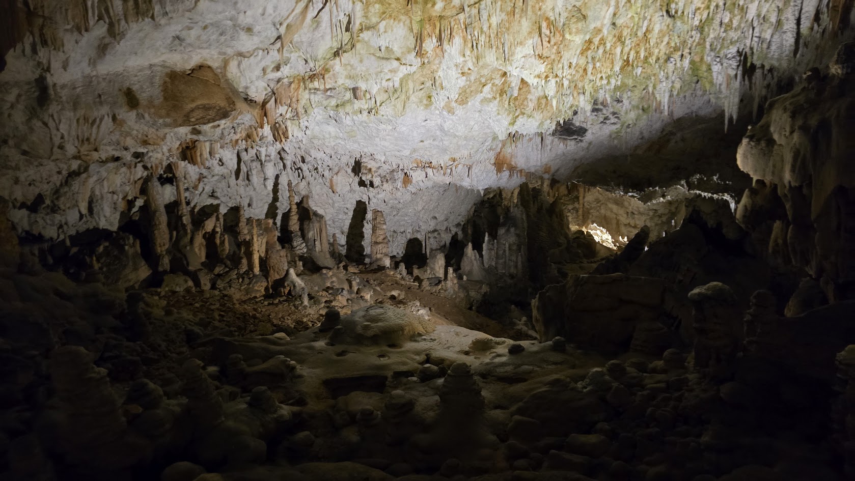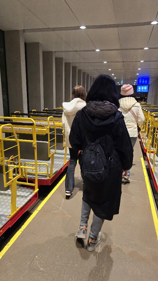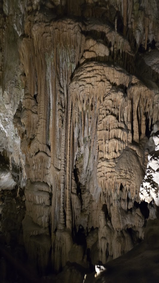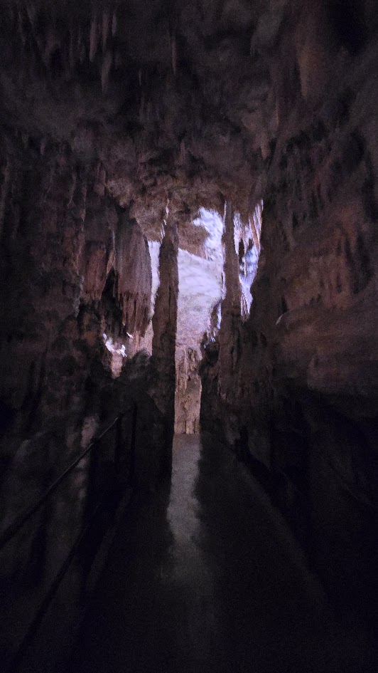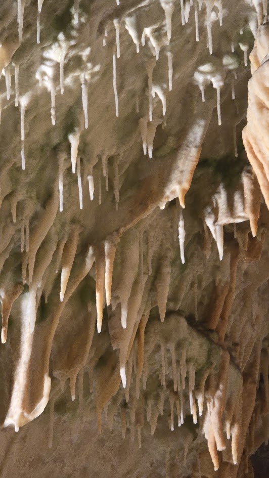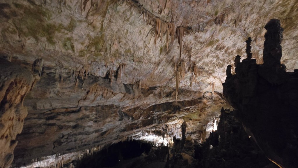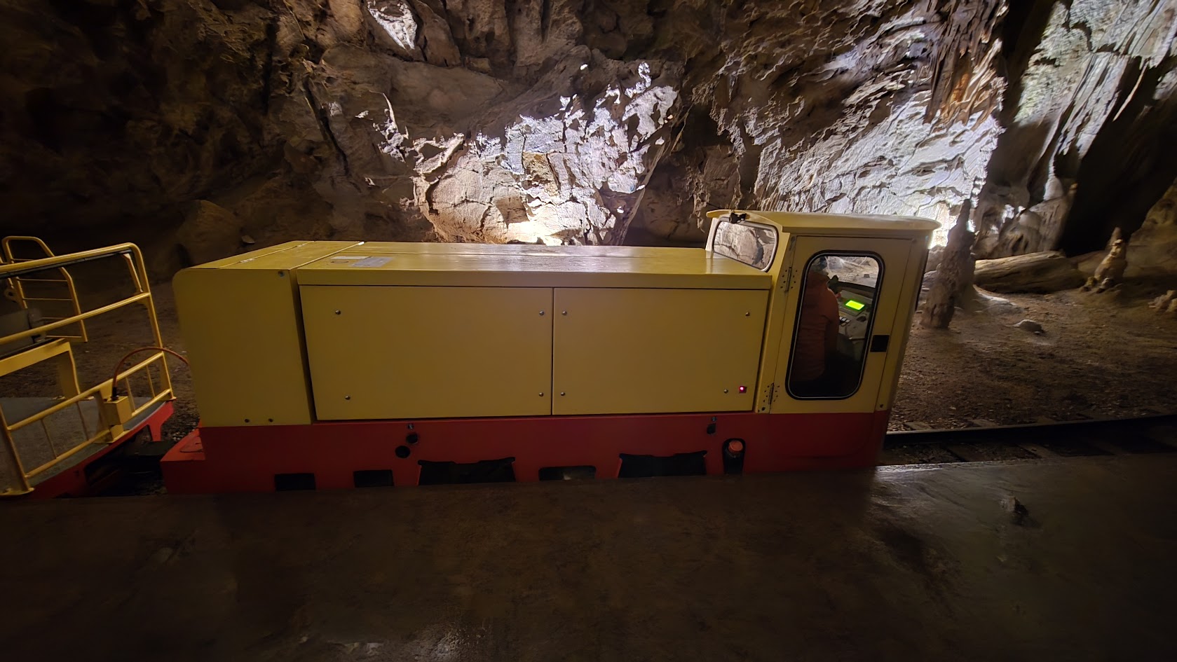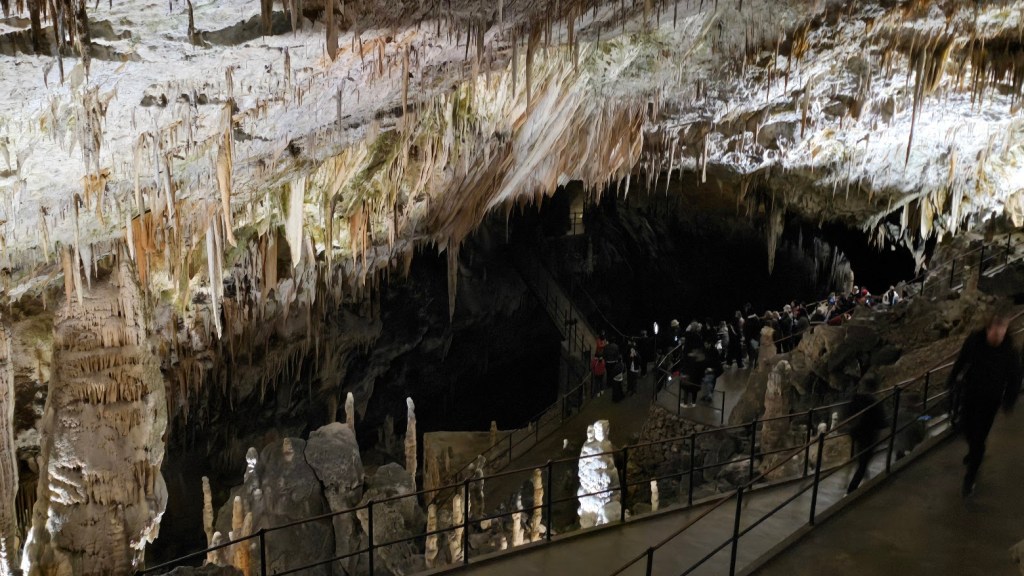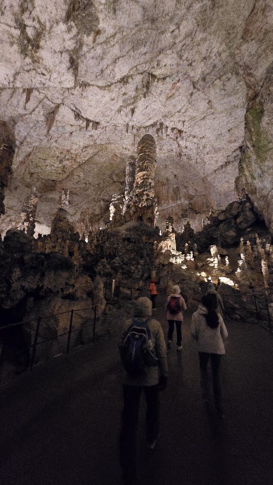 雖然交通順暢,我們提早到了,還是要等預定的時間 10:45 才能進場。進去洞穴要先搭小 “火" 車,然後下車徒步。這個洞穴據說是斯國第二大、但是第一個被發現的石灰岩溶洞,也是喀斯特地形被命名由來。光是坐小火車進去,沿途開錄影就錄了 7’17″,基本上這裡大到匪夷所思。逛了 50 分鐘來到車站,然後搭反向的小火車出去。