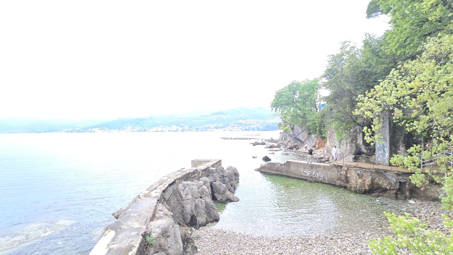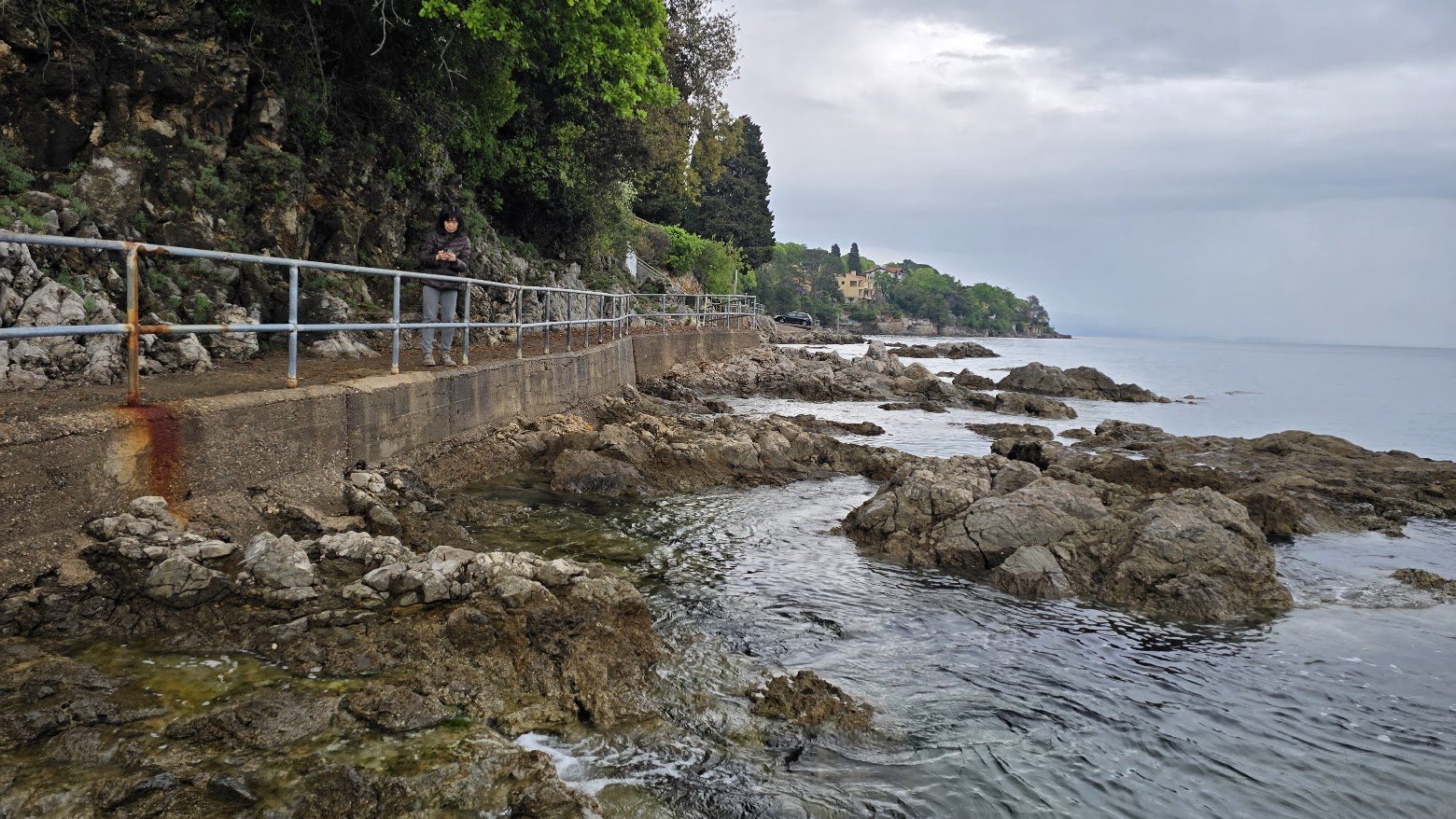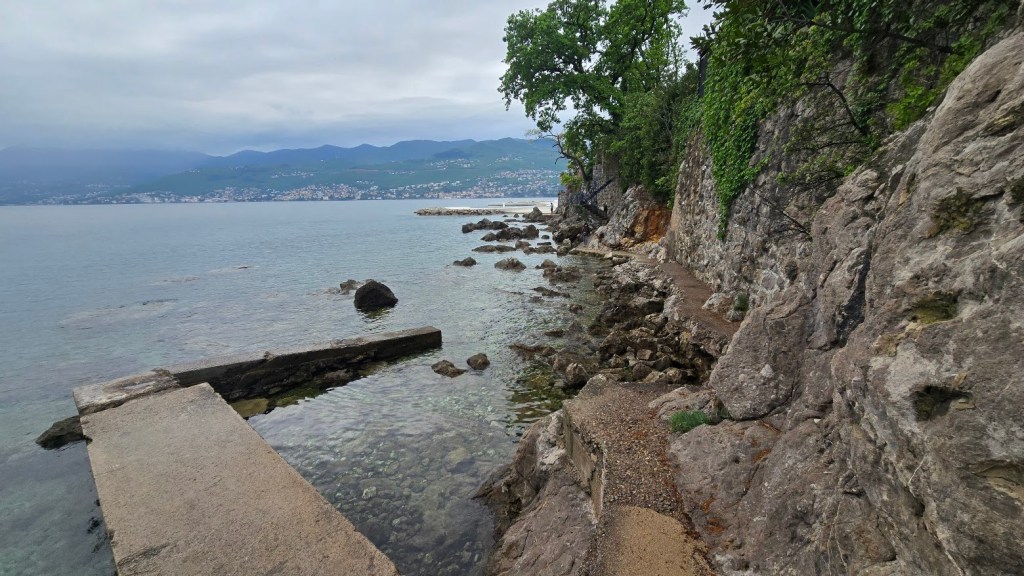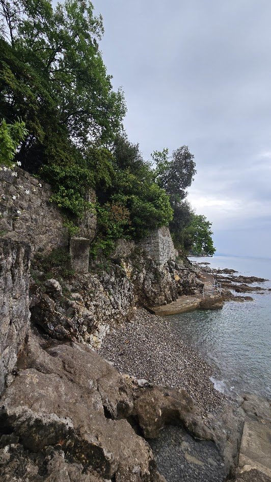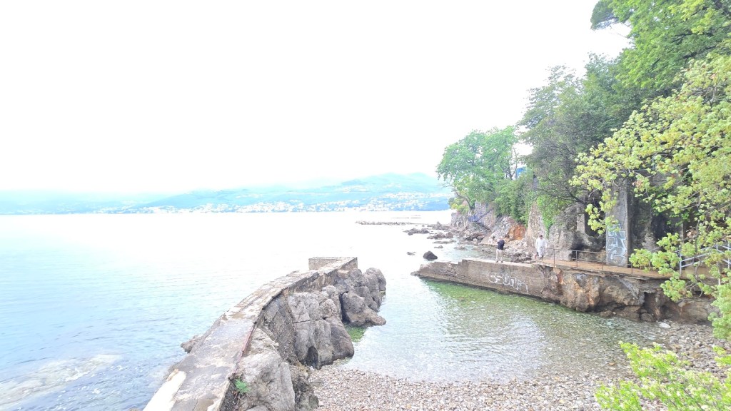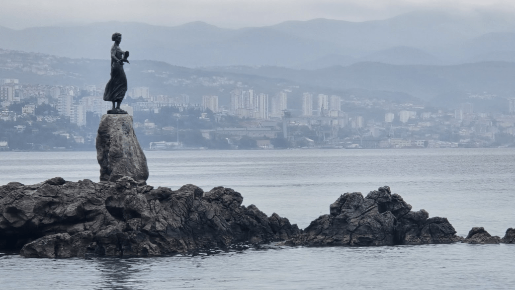 抵達歐帕提亞 (Opatija) 後,導遊先帶我們去上廁所。為什麼這件事很重要呢?首先我們拉車時間比較長了一點。但更重要的是,離開斯洛維尼亞之後, “廁所自由" 就沒有了,公廁要錢,而且不是到處都有。三十個人撐著傘、大排長龍地上完廁所;大家就冒雨去海邊看 “少女與海鷗" 的銅像。