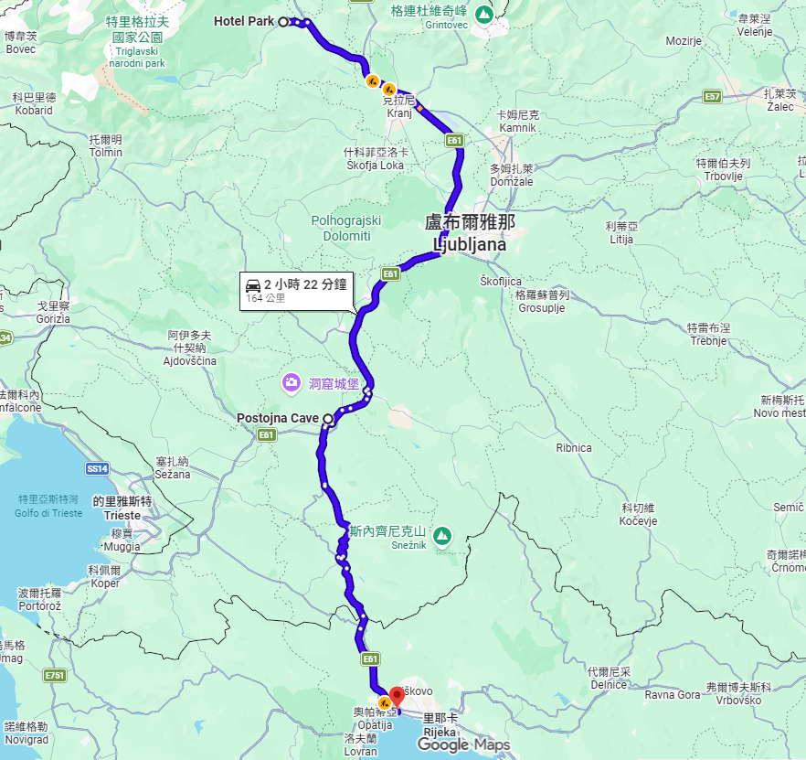 這是一個幾乎每天換旅館的行程,早上從布雷德湖畔的 Hotel Park,經過盧比安納 – 也就是 Google Map 上的盧比爾雅那 (Ljubijana),來看一個石灰岩洞 Postojna Cave。