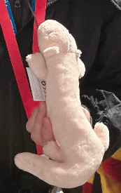 洞內據說有很多生物,但是都怕光躲起來了。其中,最特別的是盲螈,園區特別養了一些放在大型玻璃箱裡,牠們還順利生出下一代。因為不能拍照和錄影,所以只能拍官方的即時監控螢幕。紀念品店裡賣很多盲螈娃娃,基本上整隻白白不太討喜。