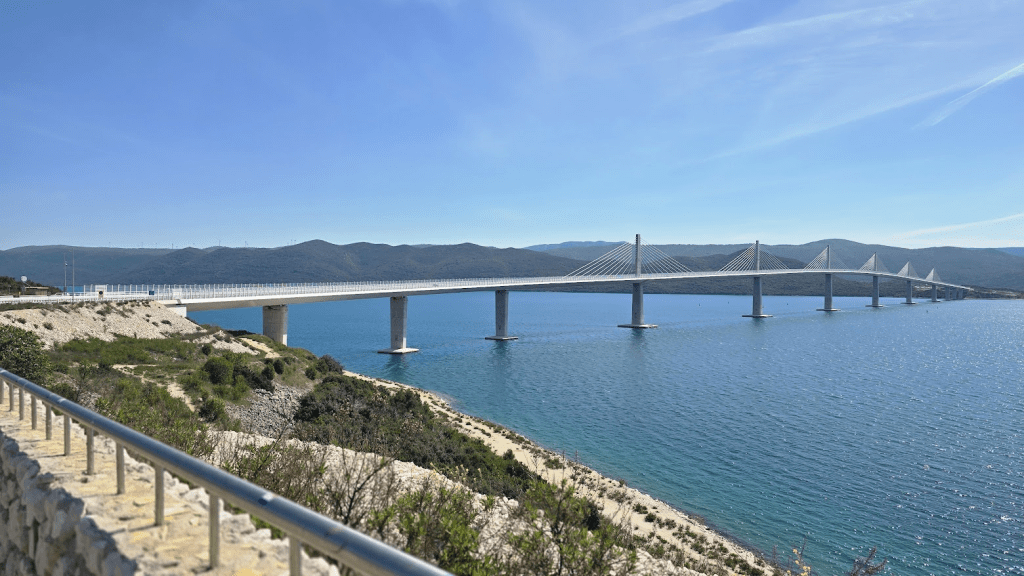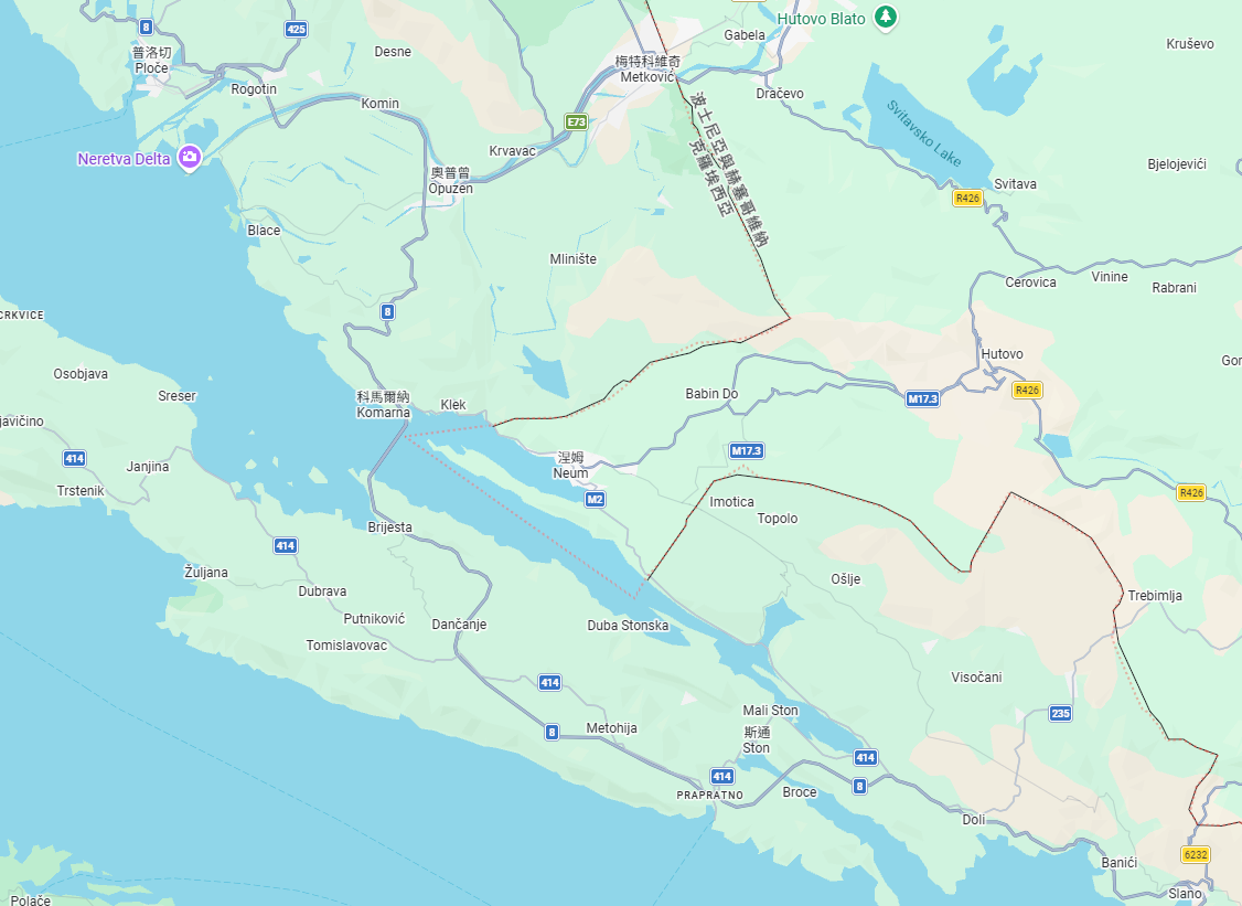 後來中國幫克羅埃西亞修了一座橋 (如下圖),從歐洲大陸的科馬爾納,把 8 號公路接到 414 號公路,這樣就可以不用經過波赫。害得波赫收不到過路費,所以該國不喜歡中國。但也有旅行團還是會經過波赫,因為這樣就可以號稱多去一個國家,各取所需。