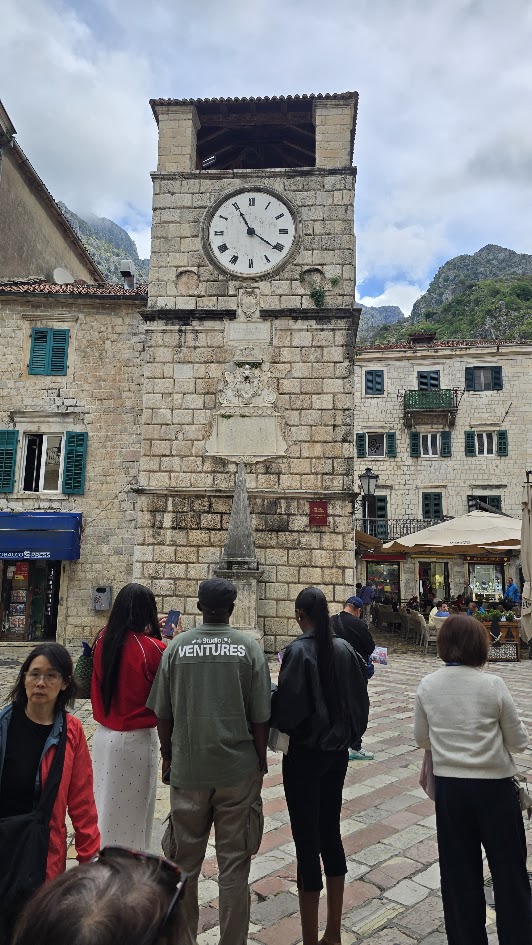 過海關之後,我們參觀科托古城。這個城市以愛貓聞名。主要是因為這裡本來就有很多貓,所以黑死病期間,老鼠不太敢進來,使得他們的疫情比較輕微。這邊還有個貓的博物館,我們沒有進去參觀,外觀也看不出什麼。導遊說門票是做公益用。下圖右是城門入口所對到的鐘和恥辱柱。