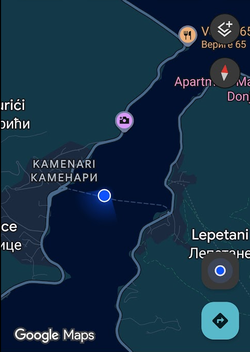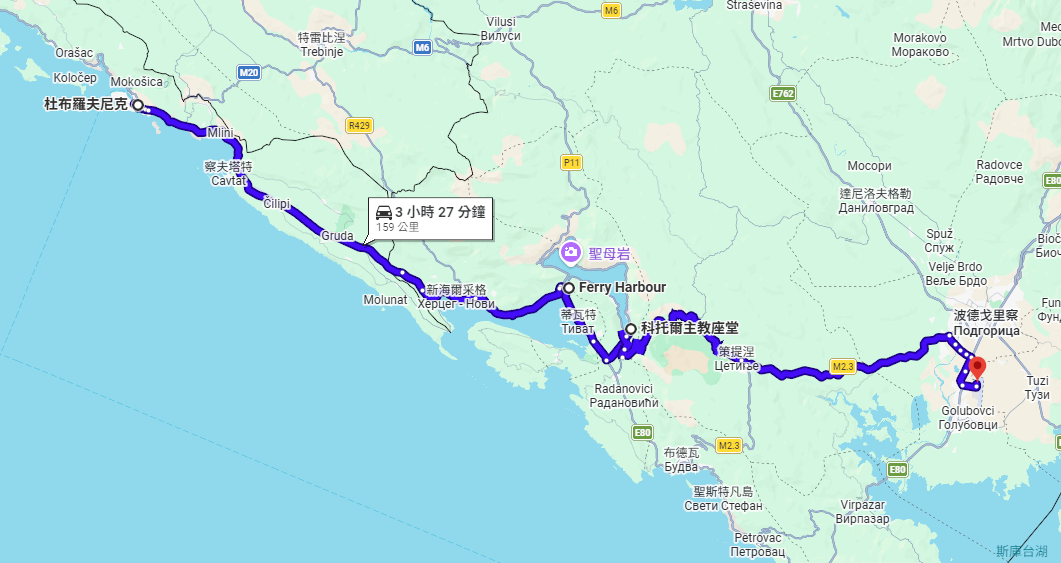 黑山這個國名來自於他們有很多這種高高的直立深色的樹 (杉木?),遠看就是一片黑黑的山。我們的路程會有一小段渡輪,不然沿著海岸開車會花很多時間。下圖是在渡輪上的 Google Map 截圖,我們可以看到該國同時使用拉丁字母和西里爾字母