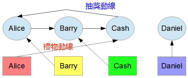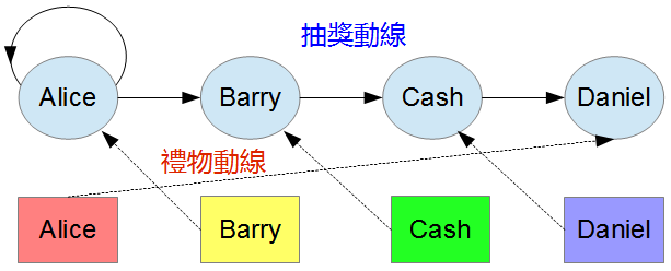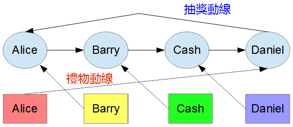 再來是交換卡的狀況, 如果規定只能和下一家交換, Alice 抽到交換卡後, 又抽到 Barry, 於是他要拿 Barry 的禮物和 Barry 抽到的 Cash 的禮物交換. 雖然 Alice 得到 Cash 的禮物, 而 Barry 竟然會得到自己的禮物. 於是我們只好改成 “交換卡是和下下一家交換". Alice 拿著 Barry 的禮物, 和 Cash 抽到的 Daniel 的禮物交換. 最後 Alice 得到 Daniel 的禮物, Barry 得到 Cash 的禮物, 而 Cash 得到 Barry 的禮物.