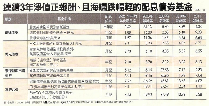 熟悉錢雜誌的人都知道, 它在每一期都會推薦 “本月嚴選基金". 我比對了一下 “嚴選"  和上面的債券基金, 重複的只有這一檔: PIMCO – 全球高收益債基金 – E 級類別美元 (收息部分). 請留意它在 2008 年可是虧了 19.92%, 雖然只有兩成不到, 比腰斬再腰斬好很多, 但是也要承受得起才行.