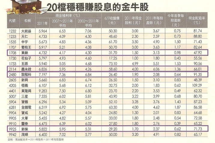 所以台幣定存基本上已經出局了. 重點應該放在股息和債息.  股息的部分請參考下圖. 被框起來的部分是錢雜誌推薦的股票. 在這一堆股票裡面我只買過葡萄王和新保, 其它都不熟.