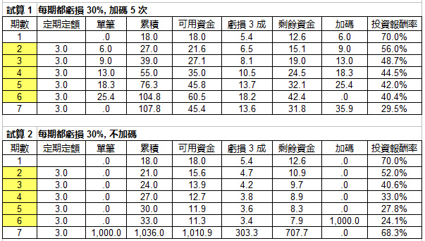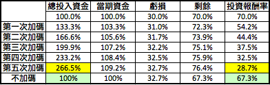 作者所說的狀況應該是試算 1, 如果是每次虧損總金額的 30% 的話, 加碼 5 次後報酬率只剩 8.3%, 所以我們就假設是當期可用資金虧損 3 成好了.