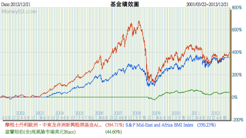 最後可能就以投資區域來一分高下吧!喜歡多投資新興亞洲的就選富蘭克林, 喜歡多投資新興歐洲的就選摩根. 最後列出他們的績效來 PK 一下. 結論是 S&P 中東非洲指數指數大勝, 看來新興亞洲和新興歐洲都沒有太多貢獻. 如果只是兩家互比的話, 摩根還勝過富蘭克林. 要買指數型基金的話, 紐約證交所代號是 GAF.