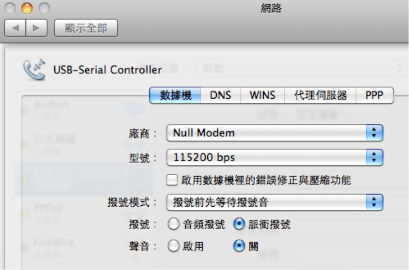 點選這個 icon, 會進入網路選項. 接著進入右下角的 “進階…". 莫驚慌, “進階" 裡面沒啥東西. 此時要選擇的 modem 是 null modem, 速率看狀況. 但撥號前等撥號音, 可以避免它亂撥號, 否則會收不到 QA board 傳回的 print, 也就是所謂的打印信息.